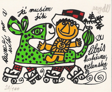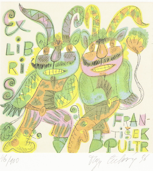 Olga Čechová (1925) další žena, která humor často užívá ve svých opusech. Připomíná mi, že humor má neskutečně mnoho tváří a jednu z nich – tu hravou, méně nápadnou tvář mi reprezentuje právě ona. Autorka ovládá suverénně všechny základní grafické techniky a malý formát je jí vlastní. Její grafiky poznám na dálku a dýchnou na mne vždy svou hravostí, fantazií a laskavým pohledem na svět. Vybral jsem z řady jejích „pohádkových“ exlibris to, které vytvořila v roce 1996 pro Františka Pultra. Dva tančící čerti s mohutnými barevnými rohy a nakroucenými kníry nezarmoutí mladého čtenáře pohádek, ani zralého sběratele exlibris (L bar., 126:128).