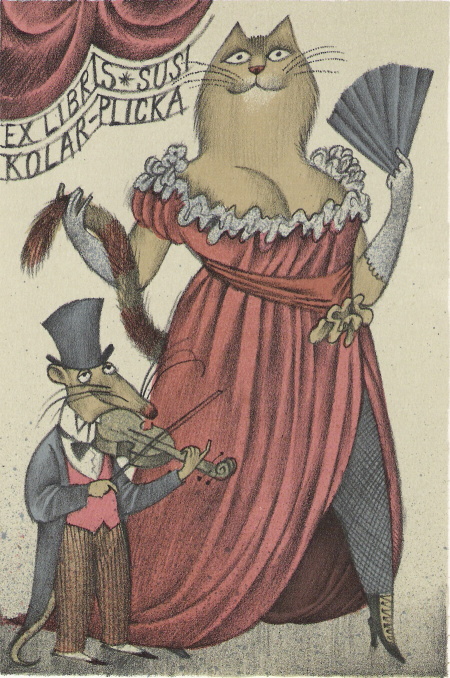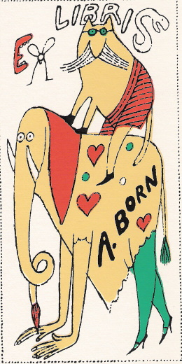 Pro současného sběratele jsou Bornova exlibris vzácným kořením (podle F.Dvořáka v Knižní značce č.3/95 jich tehdy bylo přes třicet) a hodně jich je pro cizí sběratele. Ale přeci jsem občas některou z těch „bornobajek“ v exlibris získal a jako ukázku jsem vybral: Ex libris Susi Kolar-Plicka (L bar, 172:115), rok neuveden, ale myslím, že jsem ji získal od milé staré paní sbírající kočky v roce 1986. Velká kočka suverénně se tvářící jde ve večerních šatech s dekoltem, v jedné ruce vějíř, v druhé drží svůj ocas. Malý myšák vedle ní v cylindru i ve fraku se šibalským výrazem ve tváři hraje na housle. Půvabný svět, kde zvířata se stávají rovnocennými partnery lidí. Laskavý pohled umělce na společnost, který je okořeněn dávkou satiry.