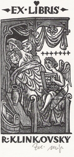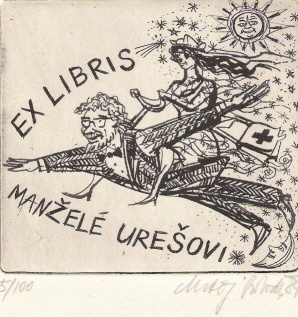 Další z autorů, které jsem objevil na „Žních…“ je Matěj Svoboda (1943). Od něho jsem získal nádherné úsměvné exlibris, které vytvořil pro manžele Urešovi. Je něm vzduchem letící, usmívající se muž, s rukama roztaženýma do tvaru křídel, na jeho zádech sedí žena, opatřená brašnou s červeným křížem. Nepochybně řídí let svého muže volantem ukotveným do jeho zad (C3, 69:76). Když si někdy vzpomenu na toto exlibris, maně hledám na svých zádech volant – tak mi ten obrázek připomíná skutečnost.