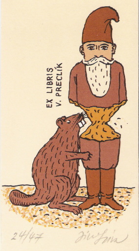 Jako ukázku zde uvedu exlibris mezi sběrateli neznámá (nejsou pro sběratele a mám je od autora). Je to Ex libris V. Preclík zhotovené pro našeho skvělého sochaře, jehož životním materiálem je dřevo. Postava zasmušilého dřevěného trpaslíka je v pase ohryzována přítomným bobrem přesně tak, jak bobři kácí stromy na stavbu hrází (L bar, 117:70). My žasneme a radujeme se z autorova chytrého pohledu.