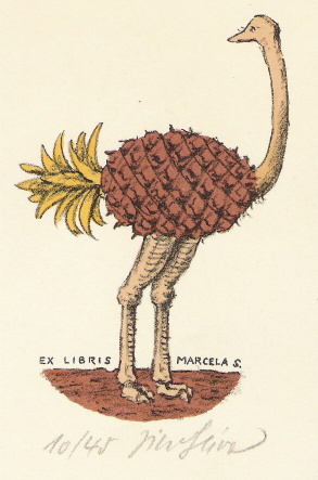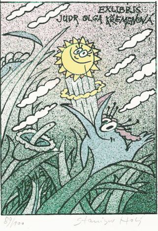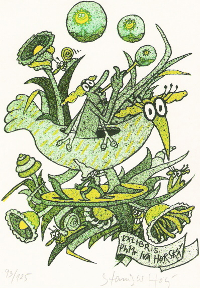 Stanislava Holého (1943-1998) řadím také ke klasikům humoru na exlibris. Vždyť úplně všechny jeho práce, které jsem viděl, měly vždy náboj humoru, laskavosti, lásky a poezie. A co navíc – vychovával si své budoucí příznivce, (možná i sběratele) mezi tou nejmladší generací, mezi malými televizními diváky a malými čtenáři. Jeho půvabné barevné obrázky svérázně pojaté přírody a postavička pana Pipa řadu let provázely i moje děti a těšily i mne. Později jsem ho našel mezi oblíbenými autory novoročenek a s potěšením jsem zjistil, že vytvořil i několik exlibris. Prohlédněte si exlibris Olgy Křemenové, které jsem si nazval „Sluníčko vychází ptáčkovi z hrdla“ (L bar, 110:81). Laskavý humor a poezie, je velká škoda, že už autor nás nepotěší dalšími svými nápady.