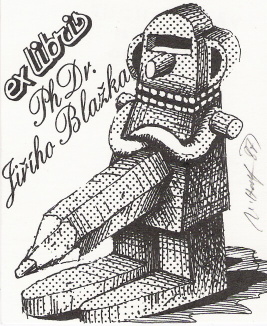 Od brněnského autora Václava Houfa (1949) mám velkou sérii kosmických a robotových exlibris vytvořených ofsetem z roku 1986. Jeho přístup k této tématice byl poněkud nevědecký, řekl bych zlidšťující, ale především vtipný. Exlibris PhDr Jiřího Blažka: Jakýsi zubatý robot, se založenýma hadicovýma rukama, z břicha (namísto z podbřišku) mu trčí pořádná ořezaná tužka (P1, 82:70). Co asi se dá dělat s takto umístěnou tužkou? Psát asi nepůjde. Také velmi zajímavý autor z osobitými a ojedinělými tématy, námi sběrateli zcela nevyužitý.