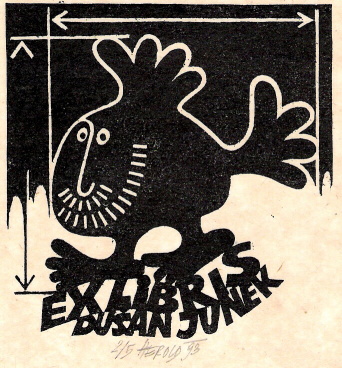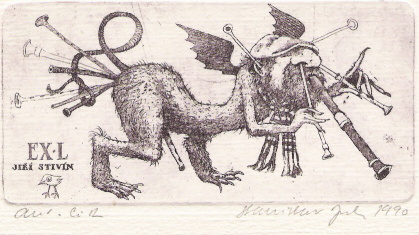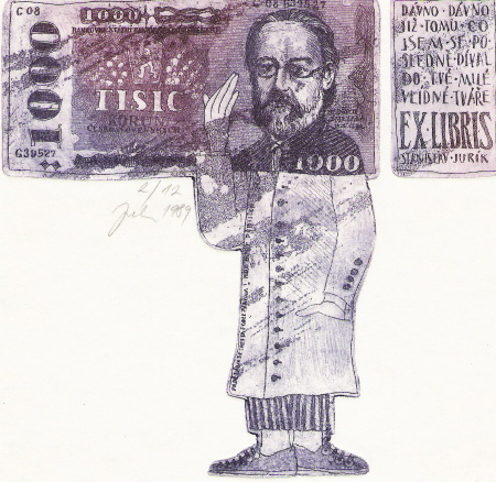 Na jedné z výstav Žeň českých a slovenských exl jsem objevil Stanislava Juríka. (1948-1993). Byl pro mne zjevením, svůj perfektní grafický projev používal pro inteligentní, „vědoucí“ humor. Jako ukázku jsem vybral Jurikovo vlastní exlibris. Na něm je zobrazena poslední československá tisícikoruna (od Albína Brunovského) se skladatelem Bedřichem Smetanou (pamatujete se na ni ?). Ke zde zpodobenému poprsí je přiděláno i velikánovo tělo, kynoucí nám rukou. Vpravo namísto bílého okraje bankovky je text „Dávno dávno již tomu co jsem se posledně díval do tvé milé vlídné tváře“ (C3/2, 112:116). Velká škoda, že už další Jurikovy skvělé kreace do našich sbírek nepřibudou.