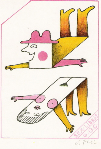 Jiří Fixl (1950) je autor, kterého jsem objevil též na jedné ze „Žní“. Jeho obrázků mám poskrovnu, ale všechny jsou opravdu „napadnuté“. Nejvíce se mi líbí jeho sex libris G.G.C. (L bar, 115:82). Postavy ženy a muže jsou provedeny jako ploché papírové postavičky –ležící ženská čeká na přistání radostně se tvářícího přilétajícího pána, který plachtí s roztaženýma rukama (kdyby takhle létal Ikaros, nedopadl by jak dopadl!). Šťastnou cestu, ale kam jste se ztratil nám sběratelům v posledních letech pan Fixle?