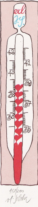 Vlastimil Sobota (1953), je grafik nám všem dobře známý, který vytvořil mnoho svých litografií pro náš spolek. Každý z nás má určitě ve sbírce některou z jeho prací, které se vždy vyznačují humorným přístupem ke zvolenému tématu. Vybírám EXL J.S. litografii nezvyklého formátu, kde je zobrazen lékařský teploměr, který ale měří „lásku“ nebo spíš „zamilovanost“ tak, že namísto rtuti má červená srdíčka (L bar, 160:33). No není to půvabné?