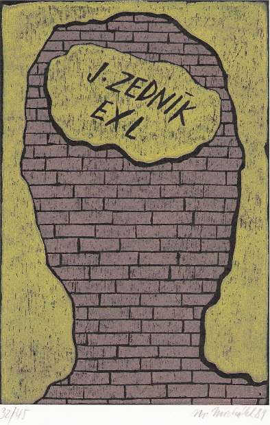 Miloš Michálek (1949) je profesor na Pedagogické fakultě Ústí nad Labem mezi sběrateli příliš zastoupen není, ale zúčastnil se řady tématických soutěží exlibris, kde byl mnohokrát oceněn. Jeho exlibris jsou vždy osobitá a snadno poznatelná, jak svým provedením, tak lapidárně zobrazenými nápady. Používá izolované fragmenty reality a vyjadřuje se strohými barevnými dřevoryty, kde používá silné nápady, často i takové, které řadím mezi humor. Jeden příklad z mé sbírky – pochází z jeho cyklu „Hlavy“ vás doufám přesvědčí. Zeď s opadanou omítkou ve tvaru hlavy a na spraveném místě je umístěna legenda. Exlibris J.Zedník (C2 bar, 149:100). Využití jména vlastníka exlibris k vyvolání úsměvu má ve tvorbě exlibris silnou tradici, ale tento nápad z této řady vskutku vybočuje.