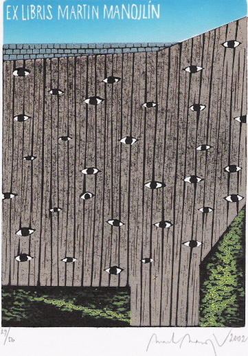 Martin Manojlín (1972) je mladý autor, nyní už pevně zakotvený mezi našimi, ale ještě více mezi zahraničními sběrateli exlibris. Vytváří často grafiky na bázi struktur materiálů, nebo struktury využívá i pro realistická zobrazení. Jeho barevné dřevořezy, s novátorskými metodami tisku a s osobitou barevností jsou snadno rozpoznatelné. V roce 2002 pro soutěž v Sint Niklaas na téma „Řecké báje“ vytvořil Trojského koně - ale jakého! Na obrázku je část koně (hřbet, bok a část přední nohy), nad jeho hřbetem je vidět hradba města Trója. Struktura prken, mezi nimi zobrazuje symbolicky oči skrytých bojovníků – ty však nehledí skrze spáry mezi prkny, ale jsou na vrcholku těchto spár mezi prkny. Vtipná symbolika, kdyby ji tak měli Trojští bojovníci ve své době k dispozici! Ano, přátelé z Tróje, sbírat a studovat exlibris se může i vyplatit! Exlibris Martin Manojlín (X2 bar, 121:90).