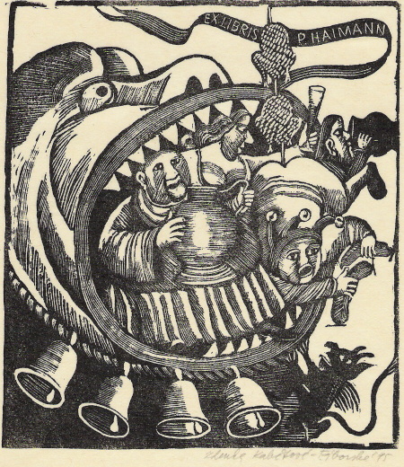 Zdena Kabátová – Táborská (1933). Od této autorky mám dva skvělé dřevořezy, provedené stylem „žáků – darebáků“ z minulých staletí, které ji pasují na důstojný ženský protějšek Zdeňka Mézla. Ukáži zde exlibris P.Haimann - v otevřené zvířecí tlamě jsou hodující služební lidé, poháry, hrnce, jitrnice, kuřata a roštu a další. Zvíře má na obojku čtyři zvonky a do tlamy mu leze čertík. (X2, 127:112). Lituji jen, že takových šťastných dílek autorka nevytvořila mnohem víc.
