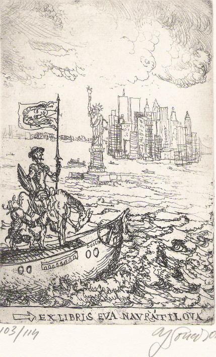 Jan Souček (1941) je skvělý malíř velkých pláten, nadaný bohatou obrazností, který dělá i malířsky pojaté lepty, ale exlibris od něho je opravdu výjimkou. O to více jsem se zaradoval, když jsem mohl do své sbírky vyměnit Exlibris Evy Navrátilové od tohoto mnou obdivovaného autora. Je na něm zobrazen don Quichote, který se Sancho Panzou na lodi „Dulcinea“ přijíždějí ke břehům Ameriky a dívají se užasle na sochu Svobody (C3, 165:108). To by byl nádherný námět dalšího dílu pro autora knihy Miguela Cervantese , kdyby žil.