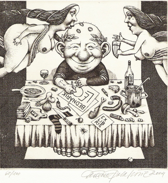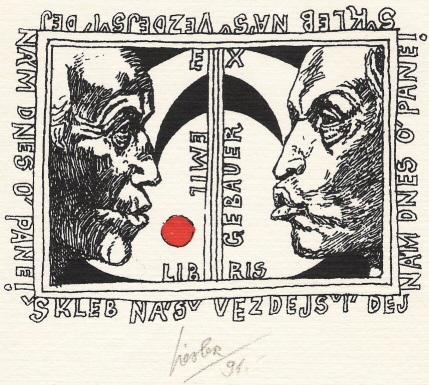 Klasik, vynikající umělec v každé oblasti, které se kdy věnoval, profesor Josef Liesler (1912-2005), zkušený harcovník v oblasti exlibris, autor žádaný a milovaný. Jeho grafiky jsou vždy plné nápadů, někdy i provokací, obsahují řadu symbolů, někdy i osobních náznaků, které nepoučený pozorovatel nemůže rozšifrovat. Ale i ty, které bez rozlousknutí skrytého obsahu mohu označit za humorné určitě každý najde. Jako skvělou ukázku jeho tvůrčí invence, vtipu i kreslířské virtuozity jsem vybral Exlibris Emil Gebauer (S, 77:106, 1991). Je to variace na jeho proslulý obraz, i uvedený text je stejný jako název tohoto obrazu: „Škleb náš vezdejší dej nám dnes ó pane!“. Smekám pomyslný klobouk a tetelím se radostí z nápadu i jeho provedení.