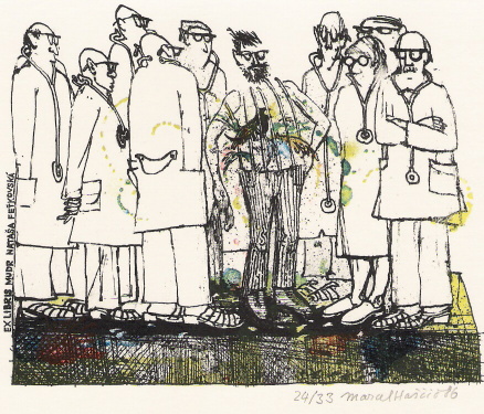 Marina Richter (1962), skvělá grafička, ovládající virtuózně litografii i tisk z hloubky. Její obrázky často mají silný sexuelní náboj a bývají provoněny secesí. Ale ani vtipu se autorka nevyhýbá. Exlibris zde zobrazené zhotovila pro svého přítele – lékaře a sběratele. Exlibris doctorus urologie V.Heřman (C3, 110:72). Zobrazuje doktora ve středověkém kostýmu, tak jak si ho mnohý z nás může představovat jeho vyšetřování urologických potíží.