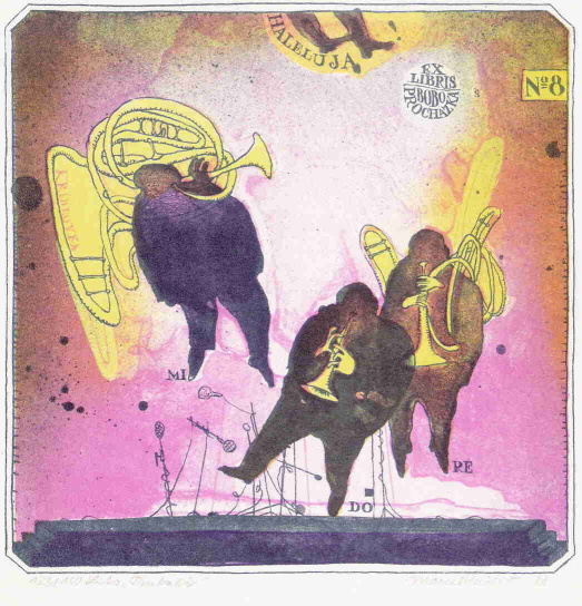 Na jedné ze „Žní…“ jsem objevil Marcela Haščiče (1954). Jeho práce se mezi sběrateli téměř neobjevují a z uvedené ukázky vyplývá, že je to škoda. Je to exlibris pro jeho přítele hudebníka – a je to koncert! Exlibris Bobo Procházka (L bar, 130:130, 1988) se jmenuje „Trubači“. Nad podiem poletují postavy muzikantů zdatně foukající do složitých žesťových nástrojů. Zřejmě ti nadanější jsou opatřeni křídly a vznášejí se dle stupnice „do, re, mi“ a z toho nejlepšího muzikanta jsou na horním okaji obrázku pouze vidět nohy a nápis „Halelujah“. Barevné ladění obrázku dovršuje zlatá barva nástrojů a křídel. Skvělé nápady, skvělé provedení a to mám doma ještě mám nádherné litografované etikety alkoholu „Korenovice“ a ještě další – to už ale není exlibris.