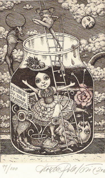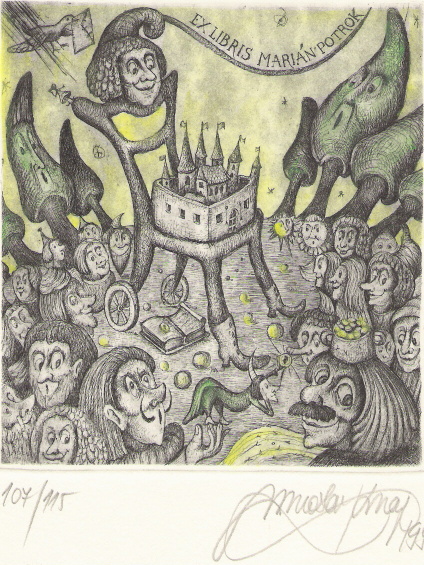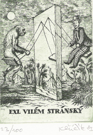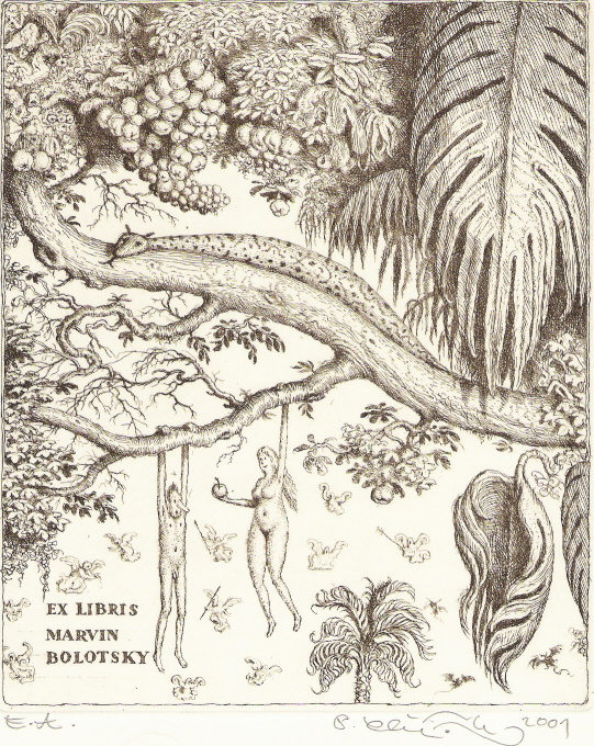 A teď už k autorům nám sběratelům více známým. Peter Klúčik (1953) oplývá nezměrnou fantazií, vytváří ničím nespoutanou floru a z jeho obrázků by se dala vytvořit Klúčikova učebnice dosud nevídané fauny. Říkám tomu „Klúčikland“. Exlibris pro amerického sběratele Marvina Bolotskeho je z roku 2001 (C3, 165:138) a Klúčikovo pojetí Ráje je mne vždy přivede ke spokojenému pochechtávání. A taky téměř vždy v té spleti lian, stromů, květů a zvířat objevím nějakou další souvislost a špílec. Smekám před jeho nápady a jeho fantazií a jeho výtvarnému projevu, který je dovádí k dokonalosti.